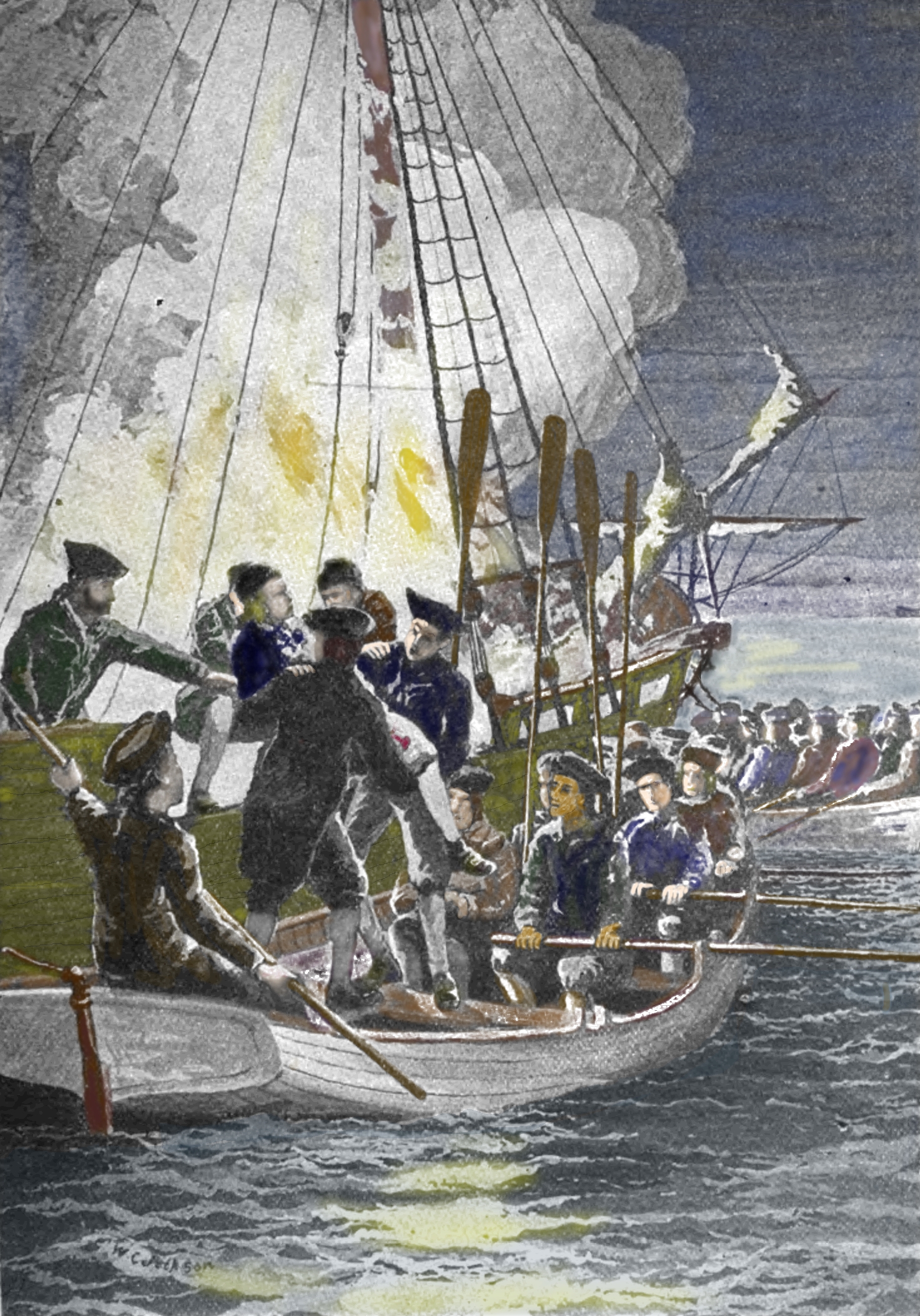 ![]() The vessel was then set on fire... by Frank T. Merrill Colorized by Dan Shippey, 2010 The Breed's Hill Institute permission granted for noncommercial use. |